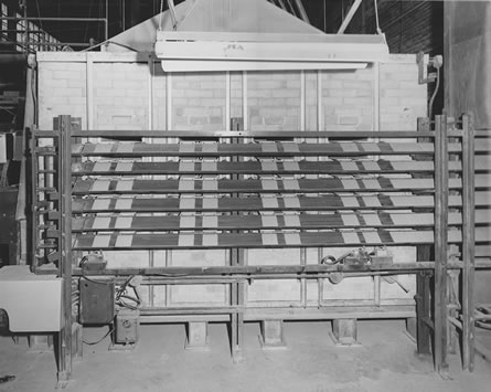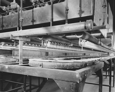 ![]() 8. Conveyor used to turn tiles over. Note tiles on top belt are upside down (as they come from press). Tiles on lower belt are right side up. |